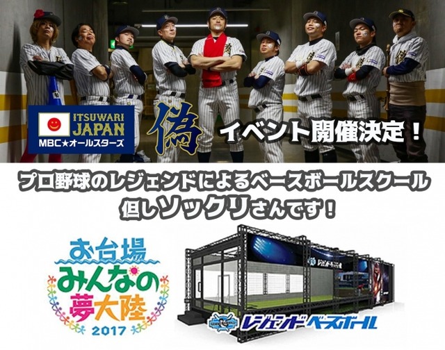 レジェンドベースボール株式会社(本社:東京都新宿区、代表取締役社長:山内恵一)は、東京・お台場にて株式会社フジテレビジョン主催の「お台場みんなの夢大陸2017」にて、野球モノマネ芸人集団「偽ジャパン」による『プロ野球のレジェンドによるベースボールスクール。但しソックリさんです!』イベントの開催決定をお知らせいたします。