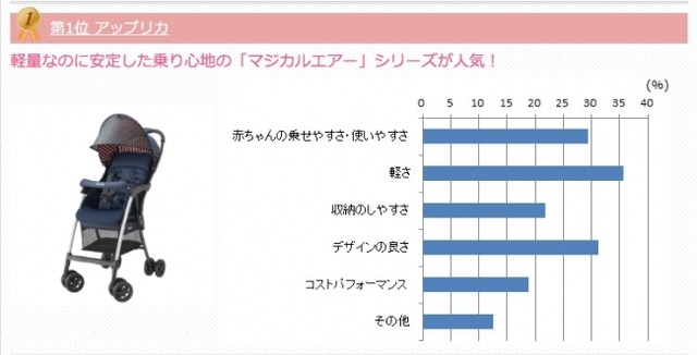 「マジカルエアーシリーズ(アップリカ)」が1位を獲得しました。「マジカルエアープラスAC。軽くて畳みやすくて、自立するところが気に入っています。荷物を入れるカゴも付いているので、大変満足しています」(30歳女性、お子さん10ヶ月)「マジカルエアー AD。軽量で小回りがきくので使いやすい。子どもも2歳だが、一応持って出掛けるということがしやすい。電車内でもかさばらない」(30歳女性、妊娠10ヶ月、お子さん2歳)など、機能性が高く評価されているようです。