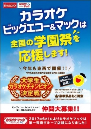 ビッグエコーでは、全国の大学祭を盛り上げる「大学祭応援企画」を2012年から毎年展開しており、昨年は148校に協賛しました。6年目となる今年は、6月1日より当社グループとなったカラオケマックも加わり、室料50%OFFのカラオケパスポートやパーティーコース無料招待券を提供します。また、各大学の代表者を募り、当社ならではのカラオケを使用したイベント「大学生カラオケチャンピオン決定戦」を、12月3日に関東と関西の2地区で開催します。優勝者には豪華賞品を贈呈するほか、通信カラオケDAMに入っているカラオケ楽曲の“お手本”となる「ガイドボーカル」に自身の歌声をレコーディングすることができます。収録されたガイドボーカルは、全国の通信カラオケDAMに配信されます。