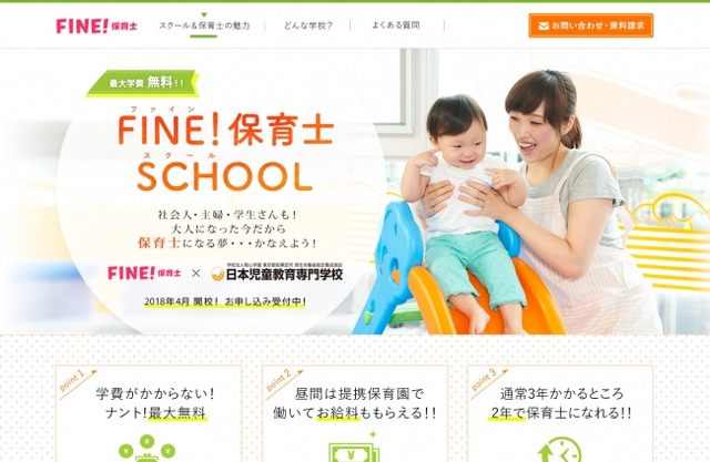 『FINE!保育士SCHOOL』サービスとは、ネオキャリアが運営する「 FINE!保育士」と創立35年を迎える保育学校「日本児童教育専門学校」が提携し、保育士資格を格安で取得できる資格取得スクールです。従来、資格を取得するには入学金・授業料・設備費・実習費・同窓会費含め2年間で合計193万円がかかりますが、「FINE!保育士SCHOOL」サービスは、「 FINE!保育士」を通して入校された場合、12万円の入学金を無料にします。また、AO入試を受ける方に関しては受験料1万円を無料にします。AO入試に合格した方は授業料が全額もしくは50%免除(注1)になります。