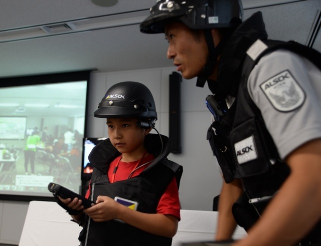 当日は抽選で選ばれた小学5、6年生19名が参加し、「人とITが融合した未来のセキュリティ」をテーマに、警備ロボットや飛行ロボット、ウェアラブルデバイスや画像解析技術などの最新テクノロジーを使った未来の警備を体験したほか、ガードマンの心得や基本動作を学習しました。またサイバー犯罪対策や高齢者介護など警備会社の活躍する領域が広がっていることを知るとともに、今回初の試みとして、心臓マッサージの技量を測定・可視化するシステムを用いた救急救命講習を受講し、一日をつうじて社会の安全安心を守る警備の仕事について学びました。