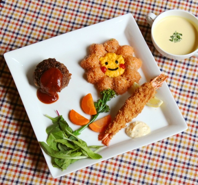 ◇内 容:にっこり笑ったお花のオムライスにハンバーグと海老フライを添えました。見た目も可愛らしいお子様用メニューです。ポタージュスープ、ミニサイズの「色の変化を楽しめるフルーツシャーベット」付き