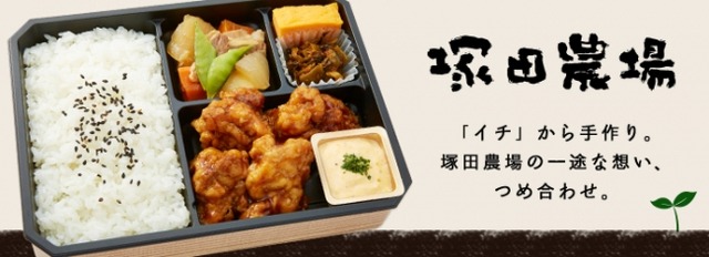 居酒屋「塚田農場」を展開する株式会社エー・ピーカンパニーは、自社養鶏場や契約農家との産地直結のモデルで全国に約200店舗を展開しています。その子会社である株式会社塚田農場プラスでは、居酒屋同様、お弁当づくりにおいても、生産者の顔が見える良質な食材を多くの人にお届けすることにより、食材産地の活性化目指しています。また、調理の面でも、肉一枚一枚を手焼き、手仕込みのたまご焼き、炊飯の水分量を毎日微調節など、食材をよりおいしくお召し上がりいただくため、ひと手間ひと手間にこだわっています。「塚田農場」のお弁当は、いずれも日本各地の生産者から直送された新鮮な食材を用いております。