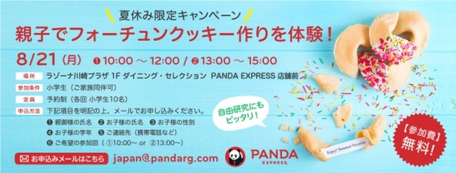 株式会社I&P RUNWAY JAPAN(本社:福岡市中央区、以下:IPRJ)の運営する「PANDA EXPRESS」は、8月21日(月)にラゾーナ川崎プラザ店で1日限定の「オリジナルフォーチュンクッキー教室」を開催します。