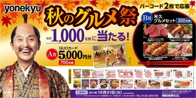今年春に好評いただいたキャンペーンに続き、今回は、抽選で「5,000円分オリジナルQUOカード」が700名様、王様のローストビーフなど米久こだわりの逸品を詰め合わせた「米久グルメセット」が300名様、合計1,000名様に当たります。対象商品のバーコード2枚を一口としてご応募いただけます。(詳細は後述)