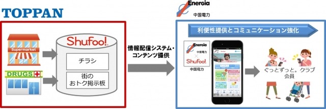 凸版印刷株式会社(本社:東京都千代田区、代表取締役社長:金子眞吾、以下 凸版印刷)は、中国電力株式会社(本社:広島県広島市、代表取締役社長:清水希茂、以下中国電力)のWEB会員サービス「ぐっとずっと。クラブ」(※1)の会員向けアプリ「中国電力×Shufoo!アプリ」を共同で開発しました。凸版印刷の運営する国内最大級の電子チラシサービス「Shufoo!(シュフー)」(※2)を活用した公共インフラ企業の契約者向けアプリが中国電力に採用され、2017年8月9日より提供開始されました。