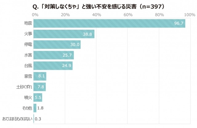 「我が家でも対策を考えておかなくちゃ!」と強い不安を感じる災害のトップは「地震(96.7%)」。次いで「火事(38.8%)」「停電(30.0%)」「水害(25.7%)」「台風(24.9%)」でした。