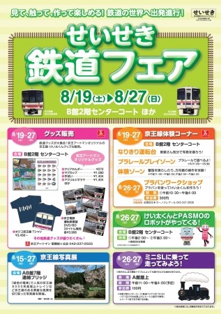 京王電鉄株式会社(東京都多摩市、社長:紅村 康)と株式会社京王アートマン(東京都多摩市、社長:小澤 孝雄)では、8月19日(土)から8月27日(日)まで、京王線聖蹟桜ヶ丘駅に直結する京王聖蹟桜ヶ丘ショッピングセンターで「せいせき鉄道フェア」を開催します。