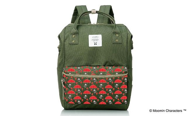 ファッション業界では隠れた万能カラーとも言われるカーキのボディに、傘を開いたリトルミイがたくさん描かれたとてもオシャレなデザインです。