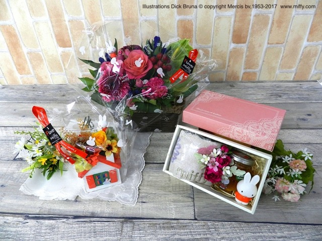 ミッフィーのハチミツとタオル、スプーンなど実用品をセットにしたボックスギフトや、「ミッフィーのミニおうちプランターカバー」に、長く飾って楽しめるプリザーブドフラワーをセットしたアイテムなど、お好みに合わせて選べるラインナップになっています。
