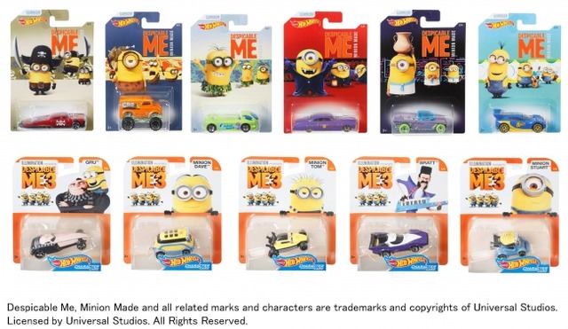 このたび、発売する「HW ミニオンズ アソート」「HW エンターテイメント キャラクター アソート」は、ともに7月21日より公開中の映画『怪盗グル-のミニオン大脱走』も好評なミニオンズがホットウィ―ルの世界観でお楽しみいただける商品です。「HW ミニオンズ アソート」はパッケージのかわいらしさと、キャラクターに由来したポップなボディーデザインがミニオンズファンの心をつかみます。