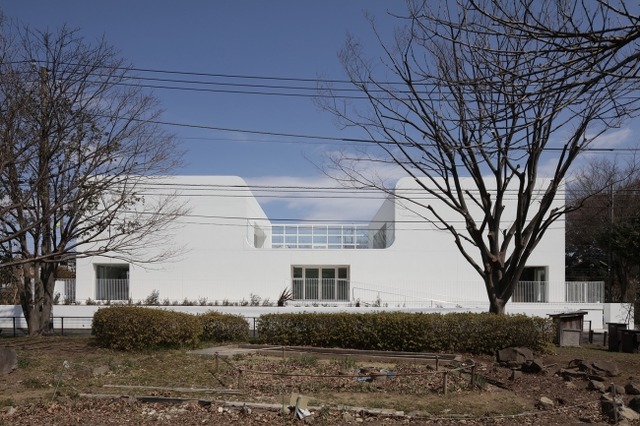 緑あふれる祖師谷公園とは対象的に、真っ白で洗練された壁面や近代的な曲線などのデザインを施すことで、公園で自然と触れ合う時間と、園舎内で実践するICT教育などのアクティビティを明確に区別しています。