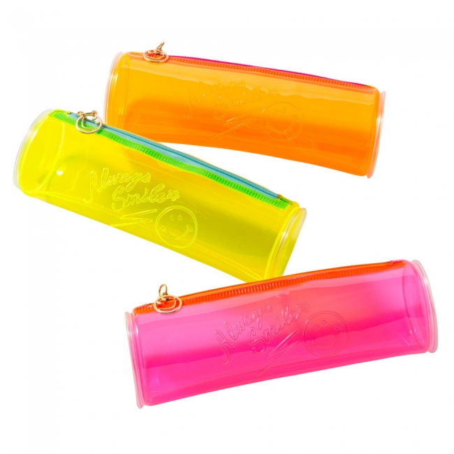 たっぷりサイズのペンケース。ジップのスマイルチャームがアクセントに。