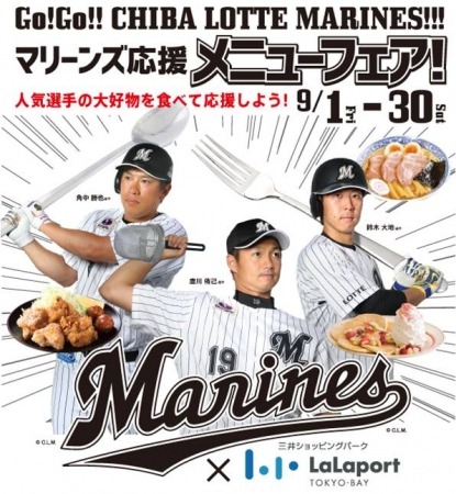 三井不動産商業マネジメント株式会社(所在:東京都中央区 代表取締役 青柳雄久)が運営する三井ショッピングパーク ららぽーとTOKYO-BAYは、2017年9月1日(金)~2017年9月30日(土)までの期間、飲食店にて、千葉ロッテマリーンズの唐川侑己選手、鈴木大地選手、角中勝也選手が大好物なメニューでマリーンズを応援する、“Go!Go!! CHIBA LOTTE MARINES!!! マリーンズ応援メニューフェア!”を開催します。