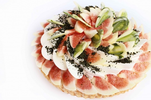 福岡県オリジナル品種で甘みの強さが特徴的ないちじく「とよみつひめ」をカスタードクリームのベースにたっぷり飾りました。八女抹茶のチョコレートとともに八女抹茶クッキークラムをあしらい、ケーキ全体で福岡県の素材の魅力を感じていただける逸品です。