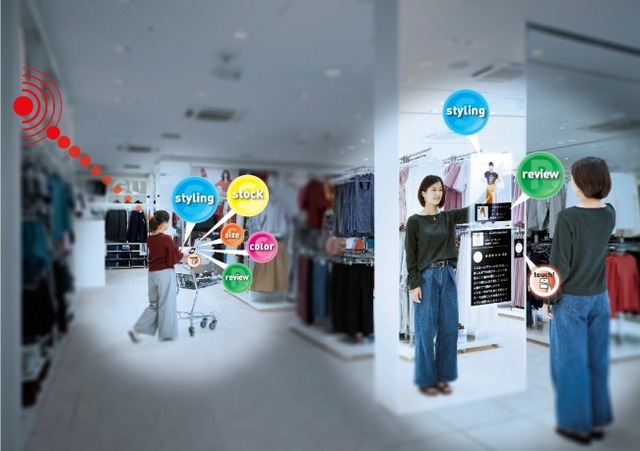 オシャレナビ・ミラーは通常時は鏡ですが、RFIDセンサーが付いており、そこに商品をかざすと、その商品を着用したモデルや一般人のコーディネート、購入したお客様の商品レビューを見ることができます。あらゆるお客様がご自身に合ったスタイリングや、「着たい!」と思えるスタイリングを発見するお手伝いができればと考えています。