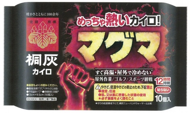 桐灰化学株式会社(代表取締役社長:中村聖一郎、本社:大阪市淀川区新高1-10-5)は、従来の‘貼らないカイロ’※よりも高温のカイロ「桐灰カイロ マグマ」を9月6日より全国一斉に新発売いたします。 ※従来の貼らないカイロとは、桐灰化学の貼らないカイロ「ニューハンドウォーマー」です。