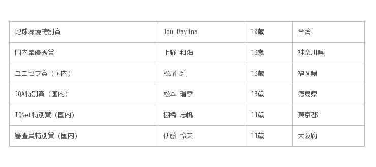 また、9月28日(木)~10月17日(火)まで開催するNAAアートギャラリー(千葉県成田市、成田空港第1ターミナル 中央ビル5F)での第18回受賞作品展示会をはじめ、過去の受賞作品を坂東郷土館ミューズ(茨城県坂東市)ほか、各地で展示いたします。お近くにお立ち寄りの際は、地球環境への想いやメッセージが込められた子どもたちの力作をぜひご覧ください。