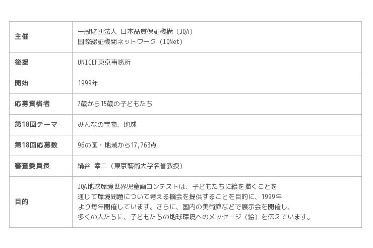 一般財団法人 日本品質保証機構(東京都千代田区、理事長:小林 憲明/以下、JQA)と国際認証ネットワーク(スイス・ジュネーブ、会場:アレクサンドル・ストイチトイウ/以下、IQNet)が主催、UNICEF東京事務所(東京渋谷区、所長:木村 泰政)後援の「JQA地球環境世界児童画コンテスト」は、第18回コンテストを開催し、6月22日(木)に行われた最終審査会にて受賞作品を決定しました。