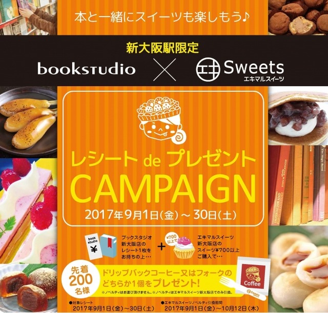 期間中、ブックスタジオ新大阪店のお買い上げレシートを持参のうえ、「エキマルスイーツ新大阪店」で700円(税込)以上購入いただくと、オリジナル「ドリップバッグコーヒー」または「フォーク」のどちらか1個を先着200名様にプレゼントいたします。