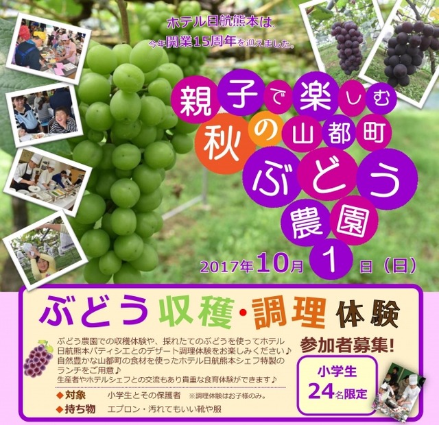 ホテル日航熊本(熊本市中央区上通町、社長:川﨑博、総支配人:熊井潤二)は、10月1日(日)に、熊本県上益城郡山都町のぶどう園「田上農園」で、食育体験イベントを開催いたします。