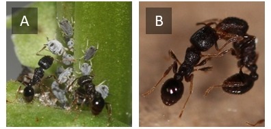 マメアブラムシの出す甘露をなめるトビイロシワアリ(A),アブラムシ経験のあるアリから未経験アリへの口移し(B).