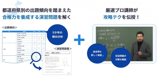 公立高校の入試は、都道府県別の制度になっており、自分の受験する出題傾向を踏まえた対策をする必要があります。『高校受験対策講座』では、過去5年分の入試問題を分析し、押さえておくべき問題を網羅した演習問題と実力派講師による解説を提供します。