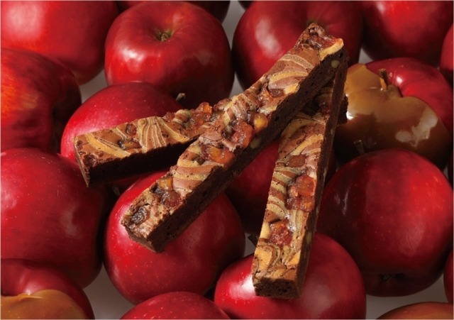 厳選した3種類のクーベルチュールチョコレートをブレンドした生地に、林檎とキャラメル、くるみを練り込みカルバドスでより林檎の風味を引き立てました。