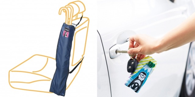 シートサイドに取り付ければ濡れた傘をすっきり便利に収納! ショルダーストラップをヘッドレストに掛けて、ゴムひもでシートサイドにキープできます。