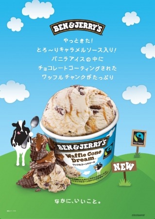 『ワッフルコーンドリーム』は、日本のベン&ジェリーズ史上初となるスワール(ソース)入りのミニカップです。キャラメルスワール(ソース)を練りこんだバニラアイスに、チョコレートワッフルコーンのチャンク(大きな具)をぎゅーっと入れたサクサクとした歯ごたえと、スプーンを入れる度「とろ~り」とする甘いキャラメルスワール(ソース)がたまらない、“夢”のようなフレーバーです♪