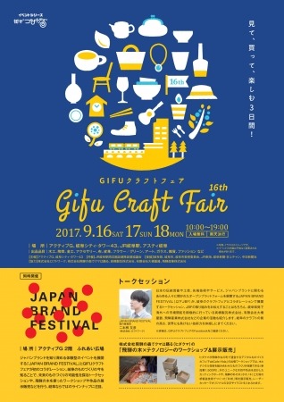 JR岐阜駅隣接施設「アクティブG」では、9月16日(土)~18日(月・祝)に、JR岐阜駅周辺施設にて「16th GIFUクラフトフェア」を開催いたします。16回目の今年は、ジャパンブランドを支援するプロジェクトやイベントを展開している「JAPAN BRAND FESTIVAL」とコラボレーションし、岐阜の伝統技術やクラフトの質の高さも発信します。