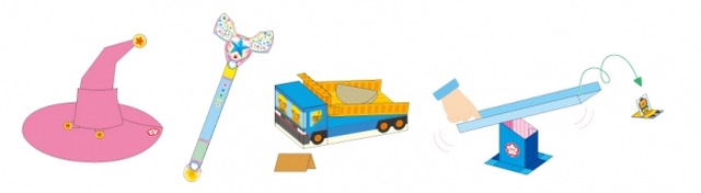 切る・はる・折るの基本的な作業からはじめ、複雑な線を切る、ねじってはり合わせる、山・谷交互に折り重ねるなどの作業をしながら、さまざまな立体の作品を組み立てます。できた作品は、身に付けたり、飾ったり、しかけで遊んだりして楽しむことができます。