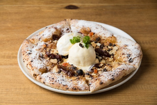 たっぷりのカスタードクリームの上にクルミやドライフルーツをのせた熱々ピッツァに冷たいバニラアイスをのせた味も食感も楽しめるデザートピッツァ。