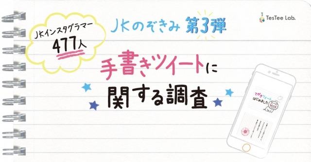 スマートフォンに特化したリサーチを軸に事業を展開する株式会社テスティー(本社:東京都港区、代表取締役:横江 優希、以下テスティー)は10~20代の若年層パネルを豊富に抱える強みを生かし、現在高校1~3年生の女性(以下、女子高生)の生態に迫る「現役JKのぞき見調査」を定期的に実施しています。第3回目はInstagram(以下、インスタ)を利用している現役女子高生477名を対象に、インスタ利用事情および「手書きツイート」に関するアンケート調査を実施しました。
