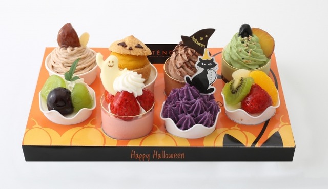 2017 年のハロウィンパーティーを盛り上げます!プチサイズのケーキを8 個詰め合わせた今年新登場のハロウィンアイテム。 左奥から時計回りに、モンブラン、かぼちゃのプチシュー、ショコラムース、小倉抹茶、フルーツババロワ、むらさき芋のモンブラン、苺のムース、ぶどうのレアチーズのラインナップです。