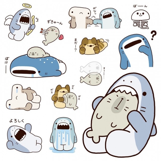 コミックやTwitterでおなじみの「ホオジロ」「イタチ」「シュモク」「ジンベイ」「アザラシ」に加え、お茶目で可愛い「ネコザメ」のスタンプも★