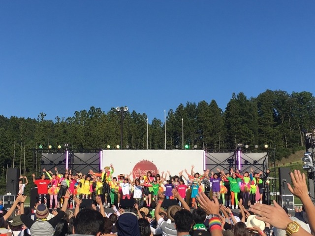 そして迎えた9月9日(土)、見渡す限り青空が広がる福島県田村市運動公園陸上競技場にて開催された「ONE+NATION music circus」。TEMPURA KIDZによるステージには、デビュー当初に着用していた衣装を着た小さな子供達から、最近の衣装を着た中高生など、総勢48名のメンバーが登場。カラフルに彩られ、いつも通りの迫力のあるステージで多くの観客を沸かせました。