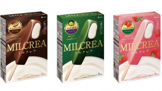 新たにリニューアルし発売となる「MILCREA」は、3種のチーズを隠し味として配合した乳脂肪分15%の濃厚なミルククリームを、生チョコレートを溶かし込んだ滑らかなチョコレートキャンディーで包み込んだ新食感のアイスキャンディーです。「MILCREA マルチチョコレート」は、外側のチョコレートキャンディーにエクアドル産のカカオマスを新たに加え、より風味のよいアイスに、「MILCREA マルチ宇治抹茶」は外側の宇治抹茶アイスのほろ苦さと濃厚なミルクアイスが絶妙にマッチするアイスとなっており、宇治抹茶一番茶の配合量をアップしております。また、今回新フレーバーとして登場する「MILCREAマルチストロベリー」は、ストロベリー果汁が5%含まれ、ストロベリーの甘酸っぱさが楽しめるアイスに仕上がっています。今回全3種類のマルチタイプがリニューアル新発売することで、より多くの皆様に「MILCREA」を楽しんでいただけるようになりました。