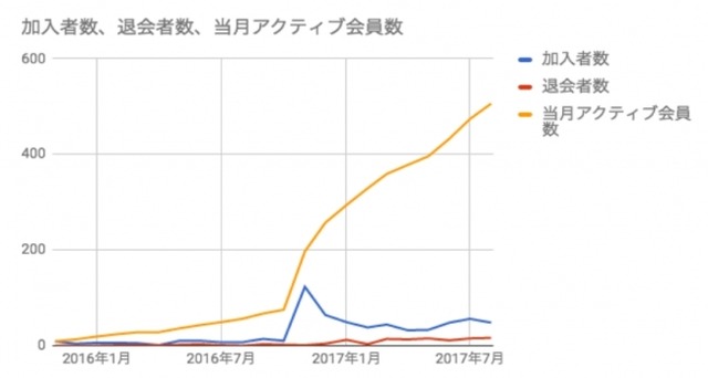 2015年よりサービスを提供しているトイサブ!の会員数につき以下の通り2017年8月にて継続会員様(退会会員を含まない)が500名様を超えました。高い平均継続率を元に、さらに規模を拡大しサービスレベルの向上に努めます。