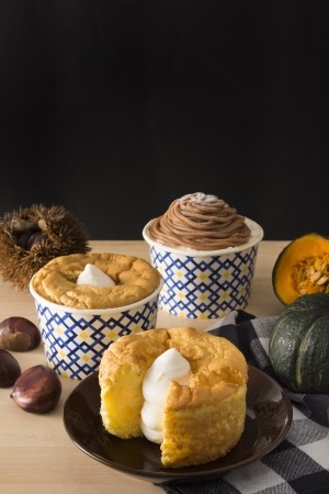 この度発売する商品は、秋の人気素材であるかぼちゃや、栗を使用したシフォンケーキ3種類です。