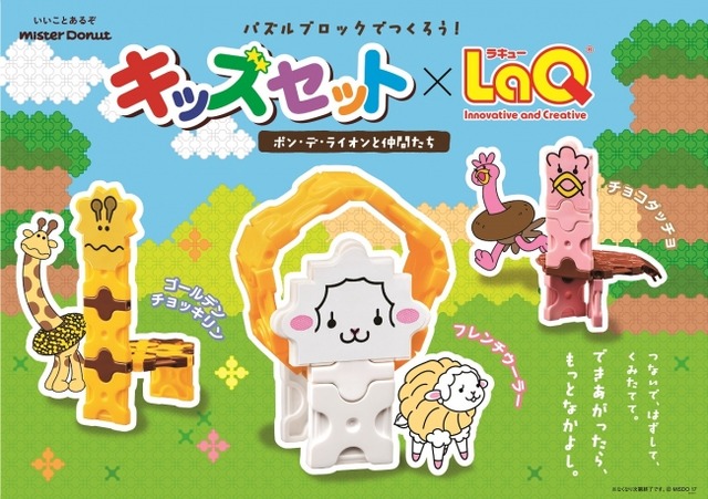 今回登場するグッズは、7種類のパーツを組み合わせてつくるパズルブロック「LaQ(ラキュー)」のミスタードーナツオリジナルセットで、ミスタードーナツの人気キャラクター“ポン・デ・ライオンと仲間たち”の1キャラクターを組み立てることができる「LaQ」のパーツとシールのセットです。