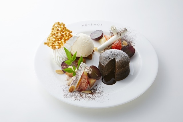 ほうじ茶ガナッシュがとろりと溶け出す温かいフォンダンショコラ、冷たいバニラアイスクリーム、サクサクのメレンゲやアーモンドチュイール、フルーツなどひと皿で異なる食感と温度をお楽しみ頂ける、アンテノール 二子玉川 東急フードショー店限定のデザートプレートです。