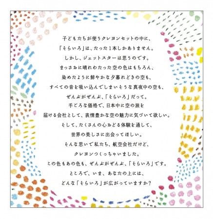 「日本の空、世界の空を、もっと身近に。」をビジョンに、多くのお客様の「もっと旅に出たい」という想いを叶えるため、いつでもお安い運賃で気軽な空の旅、空との出会いを提供し続け5周年を迎えたジェットスター。そんなジェットスターが、9月20日の「空の日」を記念し、1色の空色にとらわれない、想像をかきたてる100色の「ジェットスターそらいろクレヨン」を制作しました。