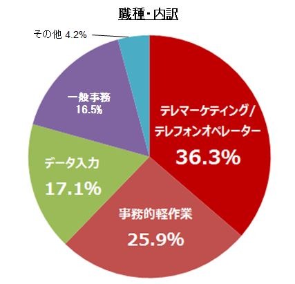 仕事情報の提供を行いやすい職種としては、コールセンターやカスタマーサポートでの電話対応(テレマーケティング、オペレーター)次いでファイリングや仕分けなどを行う「事務的軽作業」、簡単なデータ入力などが挙げられます。