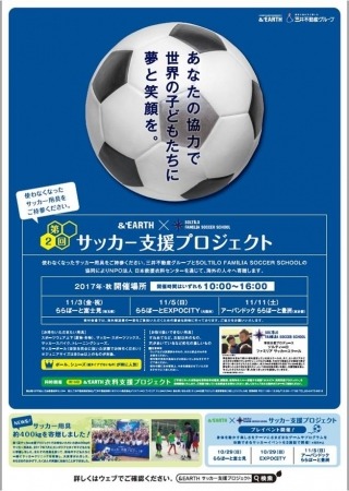 ■HONDA ESTILO株式会社と三井不動産商業マネジメント株式会社・三井不動産株式会社は、このたび『&EARTH×SOLTILO FAMILIA SOCCER SCHOOLサッカー支援プロジェクト~あなたの協力で世界の子供たちに夢と笑顔を~』を、当社グループで運営する「三井ショッピングパーク ららぽーと富士見」・「三井ショッピングパーク ららぽーとEXPOCITY」・「三井ショッピングパーク アーバンドック ららぽーと豊洲」にて、それぞれ11月3日(金・祝)、11月5日(日)、11月11日(土)に実施いたします。