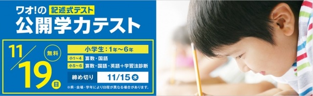 学習塾「能開センター」や「個別指導Axis(アクシス)」を運営する株式会社ワオ・コーポレーションは、2017年9月19日(火)より、「ワオ!の小学生公開学力テスト」<2017年11月19日(日)開催>の受付を開始しました。対象は小学1~6年生、申し込みは2017年11月15日(水)まで公式サイトで受付中です。