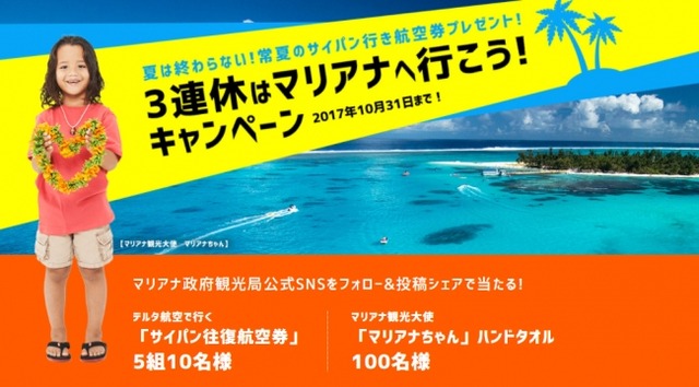 マリアナ政府観光局(東京都中央区)は、9月20日(水)より、サイパン行き航空券が抽選で5組10名様に当たる「3連休はマリアナへ行こう!キャンペーン」を公式SNSアカウント(Instagram、Facebook、Twitter)上で開始いたします。応募締切は、2017年10月31日(火)まで。航空券の他にも、マリアナ観光大使のマリアナちゃんのイラストがかわいいオリジナルハンドタオルが計100名様に当たります。