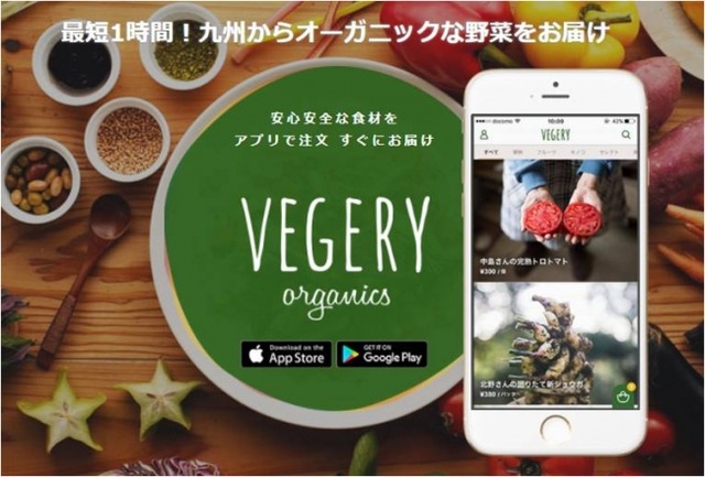VEGERYは、九州産オーガニック野菜を中心とした生鮮食品のデリバリーサービス。農薬不使用・化学肥料不使用の野菜・果物を中心に約190品をスマートフォンアプリ上で購入することが可能です。九州の農家を中心に直接赴き、仕入れを行っているため、流通コストを抑え、より新鮮な状態で販売しています。その新鮮な野菜・果物をより手軽に食べてもらうために、手軽に注文&宅配ができるスマートフォンアプリを2017年1月にリリース。アプリ経由での注文の場合、都内港区・渋谷区・世田谷区の12区域に限り、注文後最速で1時間でデリバリー、それ以外の関東地域には翌日配送を行っていました。