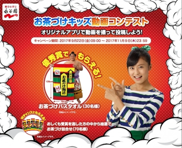 株式会社 永谷園(社長:飯塚 弦二朗、東京都港区)は、オリジナルアプリ「永谷園Cha!Cha!とCMメーカー」で撮ったCM動画でご応募いただく「お茶づけキッズ動画コンテスト」を2017年9月22日(金)より実施いたします。専用サイトに投稿しご応募いただくと、優秀作品には「お茶づけバスタオル」が当たる他、Wチャンスとして抽選で「お茶づけ詰合せ」をプレゼントします。さらに、本キャンペーンとは別に、応募時に審査をご希望の方について、弊社CMの子役審査を実施させていただきます。おいしい笑顔で、ビッグチャンスにチャレンジできる機会です!(該当者なしの場合もございます。審査については、専用サイトをご確認ください。)