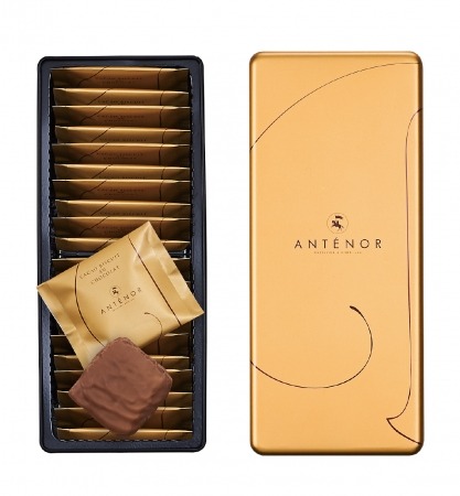 サクッとほろ苦いココアクッキー生地を、スイートとミルクをバランスよくブレンドしたクーベルチュールチョコレートでコーティングした贅沢なクッキーはティータイムにぴったり。黄金色に輝くパッケージはシックな色合いで大人の装い。20 枚入りは缶に入っており、お手土産にもおすすめです。